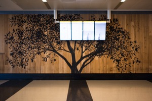 Against a backdrop of warm wood, a striking black tree mural reaches outward, creating an inviting atmosphere. The contrast between nature and modernity is emphasized by the digital flight displays above, illuminating the scene. Soft lighting casts gentle shadows, enhancing the mural's intricate details and adding depth to the composition.