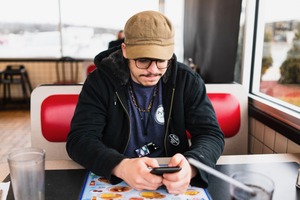 A solitary figure sits at a diner table, engrossed in his phone, surrounded by a warm yet muted interior. The soft daylight streaming through the large window contrasts with the cool tones of his outfit, creating a mood of contemplation amidst the casual atmosphere. Glasses and menus hint at the promise of sustenance, yet his focus on the device suggests a moment of solitude rather than social interaction.