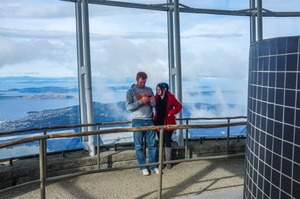 In a glass-walled lookout point high above, a couple stands close together, engrossed in their phones while overlooking a breathtaking panorama of islands and distant mountains. The soft, diffused light creates a calm and serene atmosphere, contrasting with the vibrant colors of their clothing. Wisps of clouds swirl around, adding to the feeling of being on top of the world, where intimate moments blend seamlessly with nature's vast beauty.