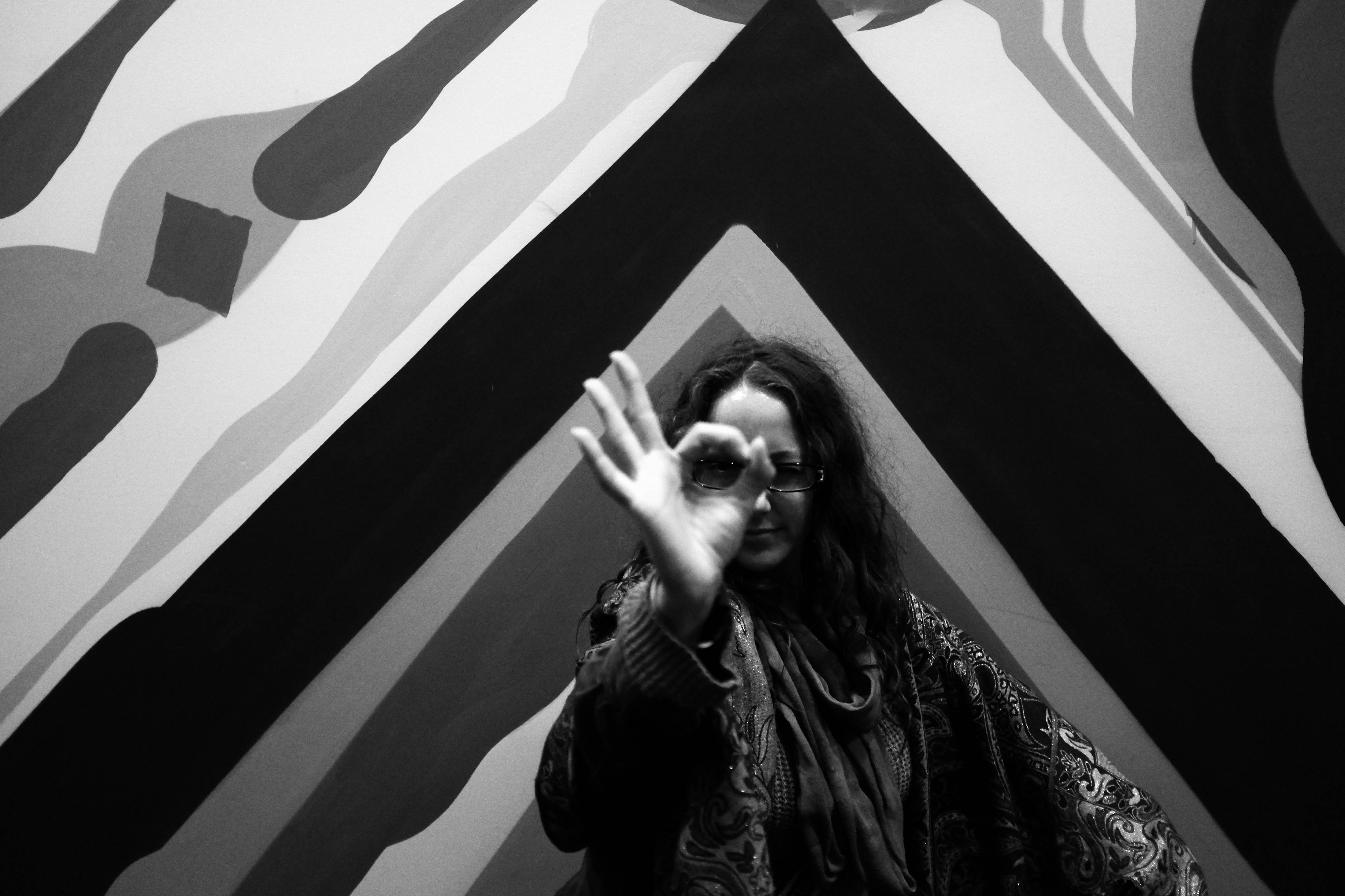 The photograph captures a woman gesturing with her hand, forming an 'O' shape, against a backdrop of bold, abstract painted patterns. The mood is introspective yet playful, accentuated by the stark contrast of black and white tones that highlight her expression and the vivid colors behind her. The composition draws the viewer's eye toward her gesture, creating a sense of connection between the subject and the vibrant energy of the surroundings.