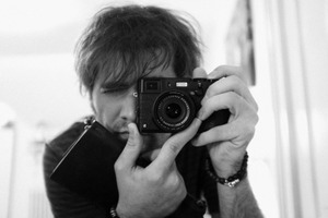 The photograph captures a self-portrait where the subject holds a camera close to his face, creating an intimate and introspective mood. Soft, diffused lighting enhances the monochrome tones, emphasizing the subject's tousled hair and thoughtful expression. The shallow depth of field draws the viewer's focus inward, blurring the background and suggesting a moment of personal reflection in a familiar space.