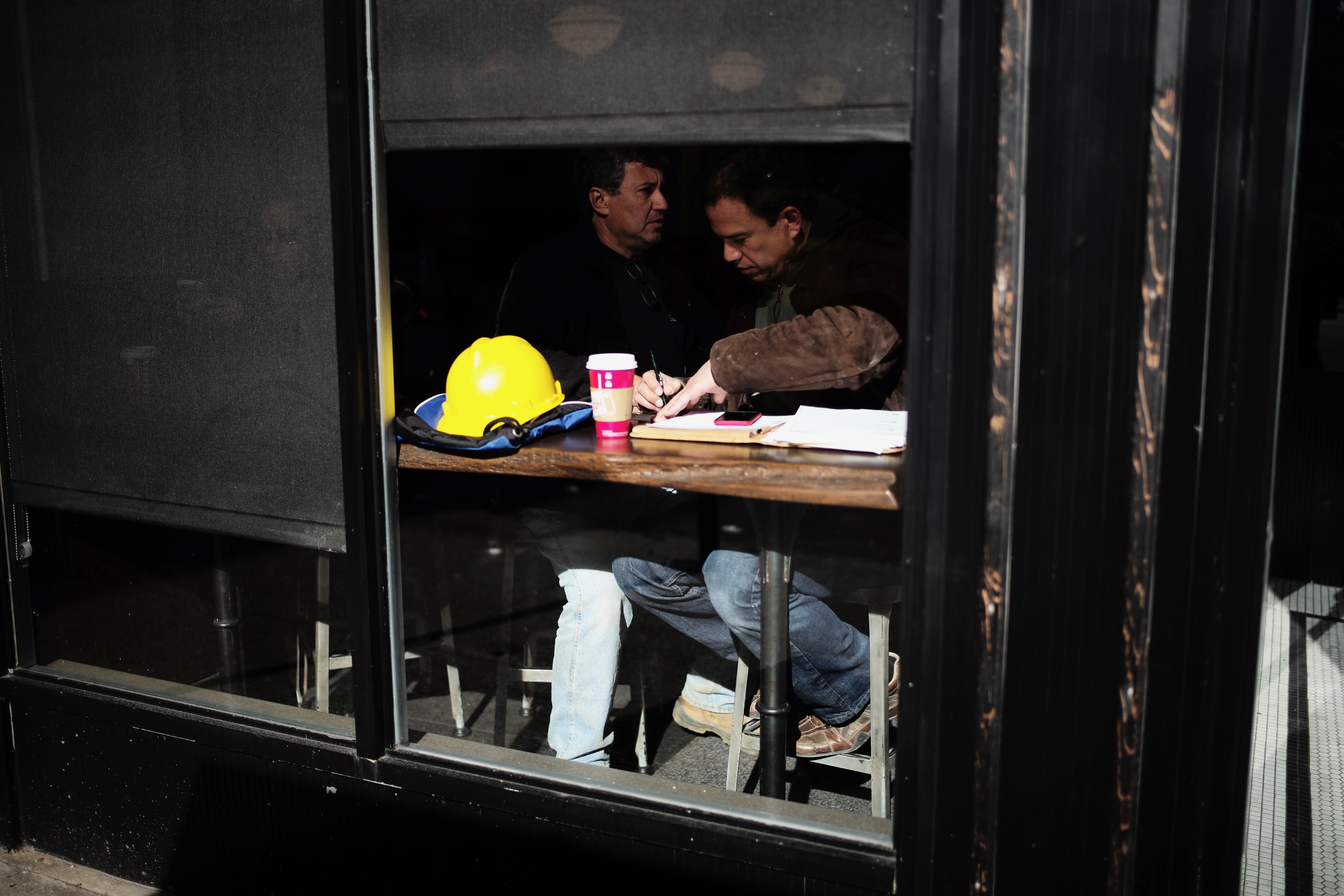 Two men engage in focused discussion at a small café table, with warm sunlight streaming through the window. A hard hat and a coffee cup sit on the table, hinting at their workday lives and the blend of leisure and labor. The intimate setting and contrasting shadows evoke a sense of camaraderie and shared purpose amidst the bustling city outside.
