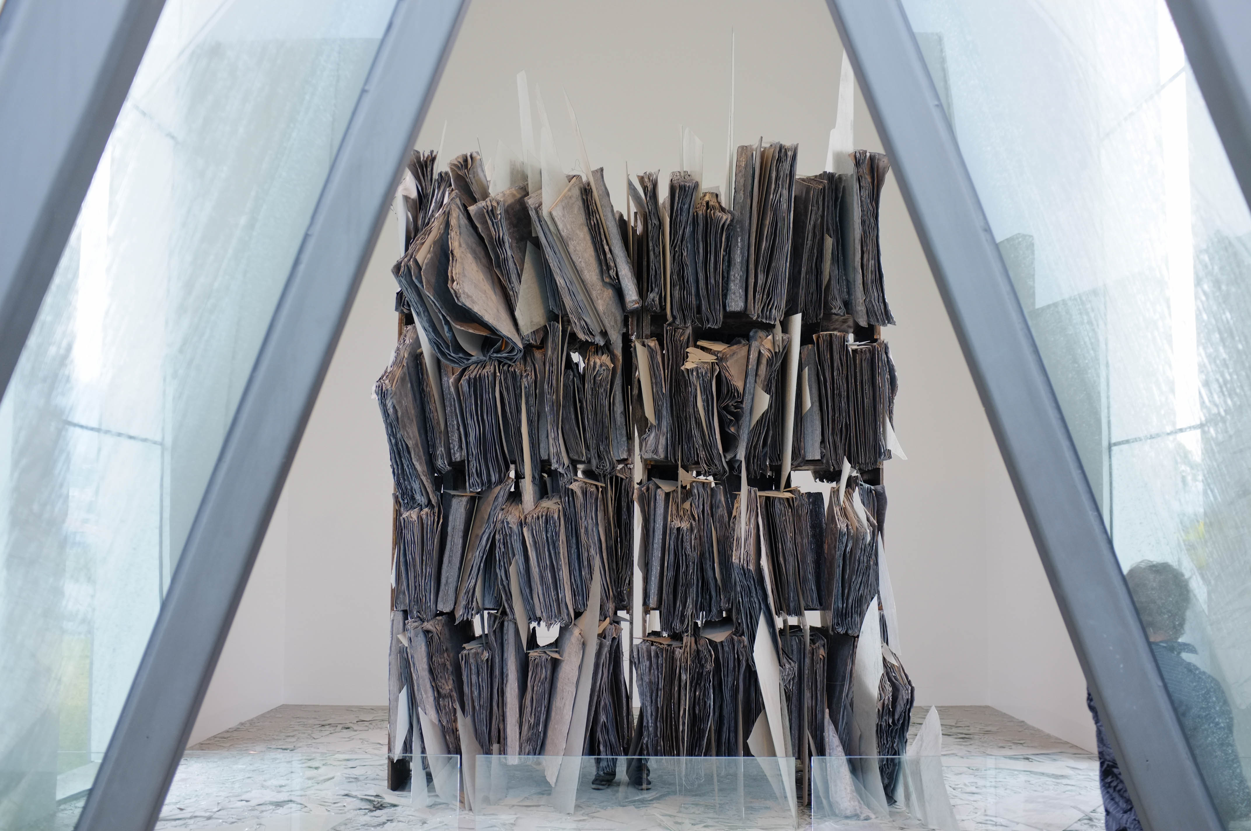 The photograph captures a striking installation composed of layered, weathered pages, evoking a sense of history and thought. The soft lighting filters through glass structures, creating a calm, introspective mood as visitors engage silently with the art. Framed by angular glass, the piece stands as a testament to both artistry and the passage of time, inviting contemplation on the fragility of memory.