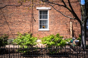 This photograph captures a serene moment of a brick wall adorned with a single, inviting window. Soft sunlight filters through the trees, illuminating the vibrant greenery below, creating a comforting and nostalgic atmosphere. The composition underscores a sense of tranquility, inviting viewers to ponder the life within the cozy space behind the glass.