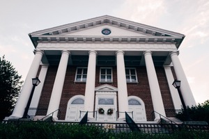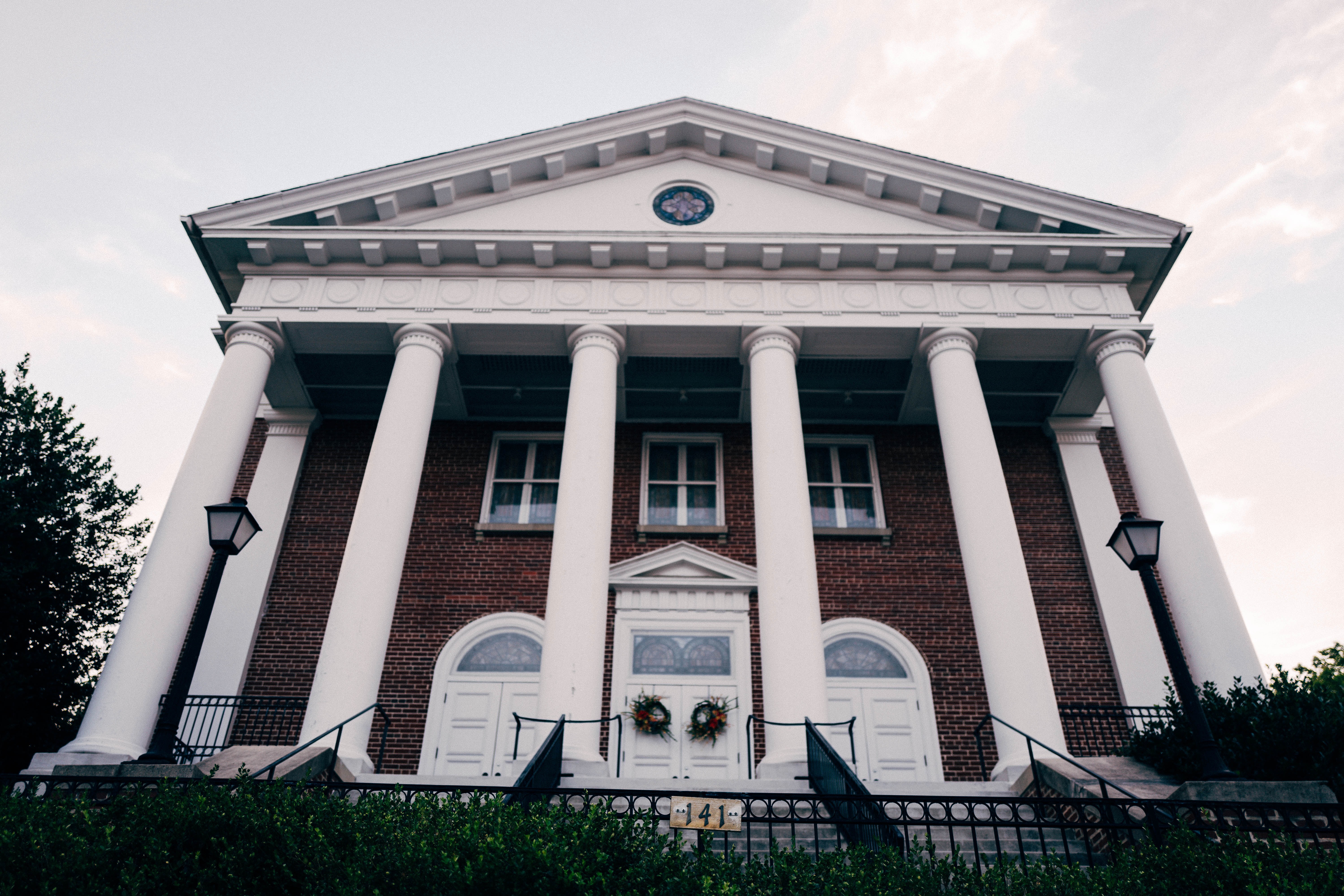 This photograph captures a grand building with tall, white columns rising prominently against the evening sky. The soft lighting adds a serene and dignified mood, while the composition emphasizes the building's architectural details and symmetry. Subtle floral wreaths on the doors suggest a welcoming atmosphere, contrasting the stately structure's formality.