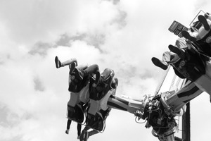 The photograph captures an upside-down view of riders suspended in motion on a thrilling amusement park ride, their legs dangling freely. The black and white composition enhances the dramatic contrast between the mechanical structure and the cloud-streaked sky, evoking a sense of both exhilaration and tension. The upward perspective emphasizes the height and intensity of the experience, inviting viewers to share in the rush of adventure.