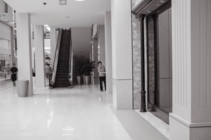 This monochrome photograph captures a spacious shopping mall corridor, illuminated by soft, natural light. The composition divides the space with figures quietly traversing the area, while a lone individual leans against a wall, adding a touch of solitude. The clean lines and reflective surfaces create a serene yet slightly stark atmosphere, emphasizing the blend of modern architecture and human presence.