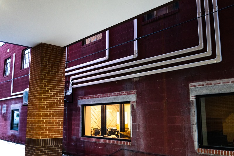 This photograph captures a striking interplay of industrial and domestic elements, featuring a stark red brick wall adorned with contrasting white piping. The composition draws the eye toward a warmly lit window that reveals a cozy interior, offering a glimpse of life amid the utilitarian backdrop. The muted lighting enhances a sense of quiet solitude, creating a contemplative mood in an urban setting.