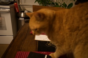 A fuzzy orange cat ambles across a cluttered tabletop, its motion creating a soft blur that enhances the sense of playful chaos. The warm, muted lighting adds to the cozy atmosphere of the kitchen, while hints of household items peeking through suggest a lived-in space. This candid moment captures the affectionate spirit of domestic life, where curiosity reigns supreme.