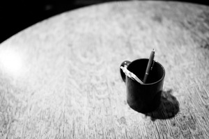 This black-and-white photograph captures a solitary cup on a wooden table, cradling a pen and a thin strip of paper. The soft, diffused light highlights the texture of the tabletop and the stillness of the scene, evoking a sense of reflection and quietude. The composition, with the cup slightly off-center, creates an intimate atmosphere, inviting the viewer to ponder the stories behind the objects.