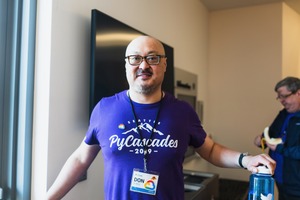 In a well-lit conference room, a man stands confidently, wearing a purple PyCascades t-shirt and glasses. The warm ambiance is punctuated by his friendly expression, conveying a sense of connection and engagement in a collaborative atmosphere, while a fellow attendee casually enjoys a snack in the background.