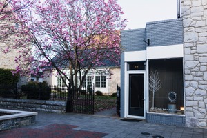 A charming street scene features a vibrant pink tree in full bloom, adding a splash of color to the otherwise muted surroundings. The composition captures the intersection of nature and urban life, with a modern storefront contrasting against older architecture. Soft, natural light bathes the scene, evoking a tranquil and inviting atmosphere that celebrates the beauty of spring.