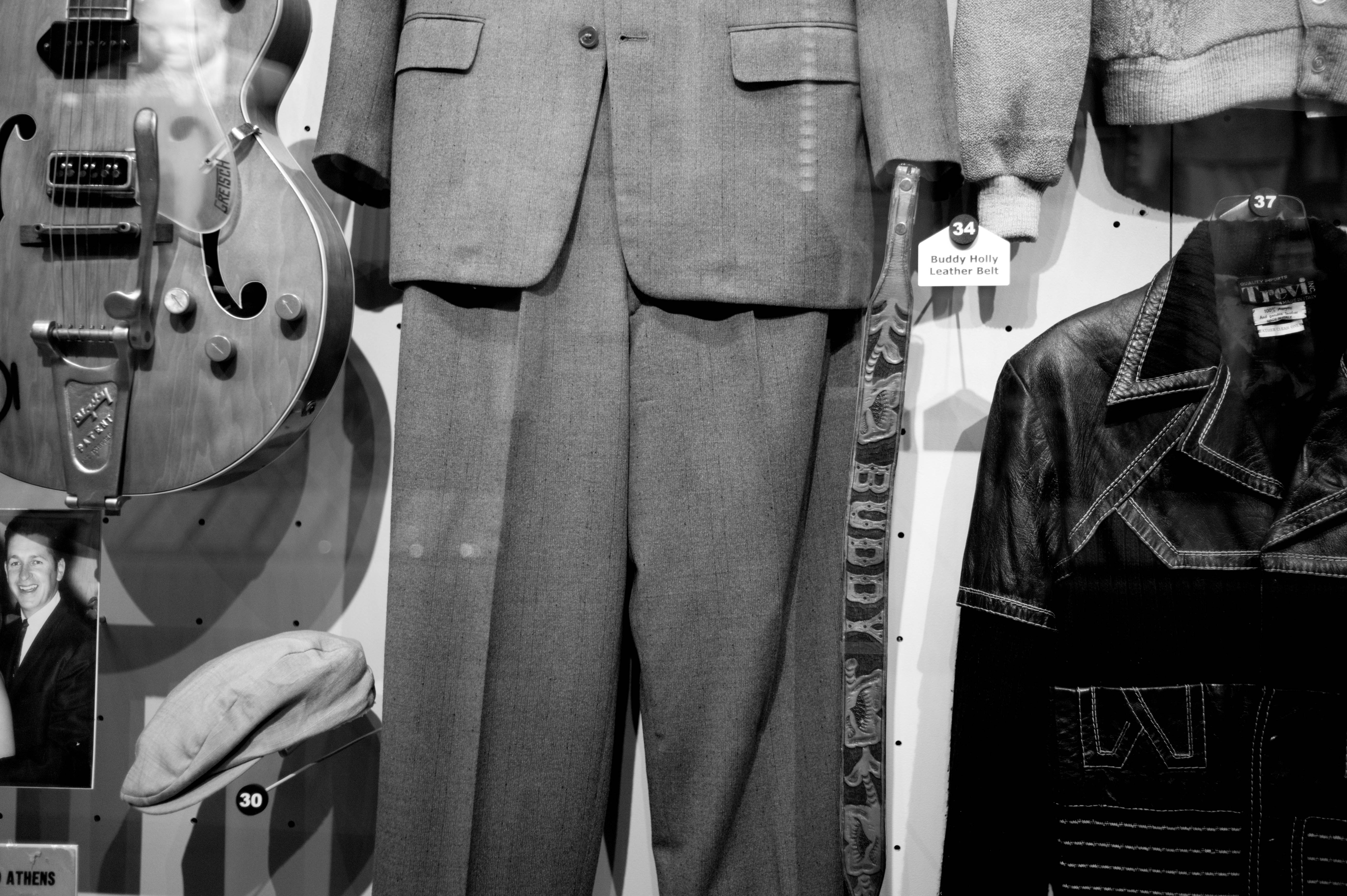 This black-and-white photograph captures a nostalgic display of iconic rock 'n' roll memorabilia, including a sharp gray suit, a vintage guitar, and a signature leather belt. The mood is contemplative, evoking a sense of reverence for the past as soft lighting highlights the textures and details of each item. The composition draws the viewer's eye across the artifacts, inviting a personal connection to the stories behind them.