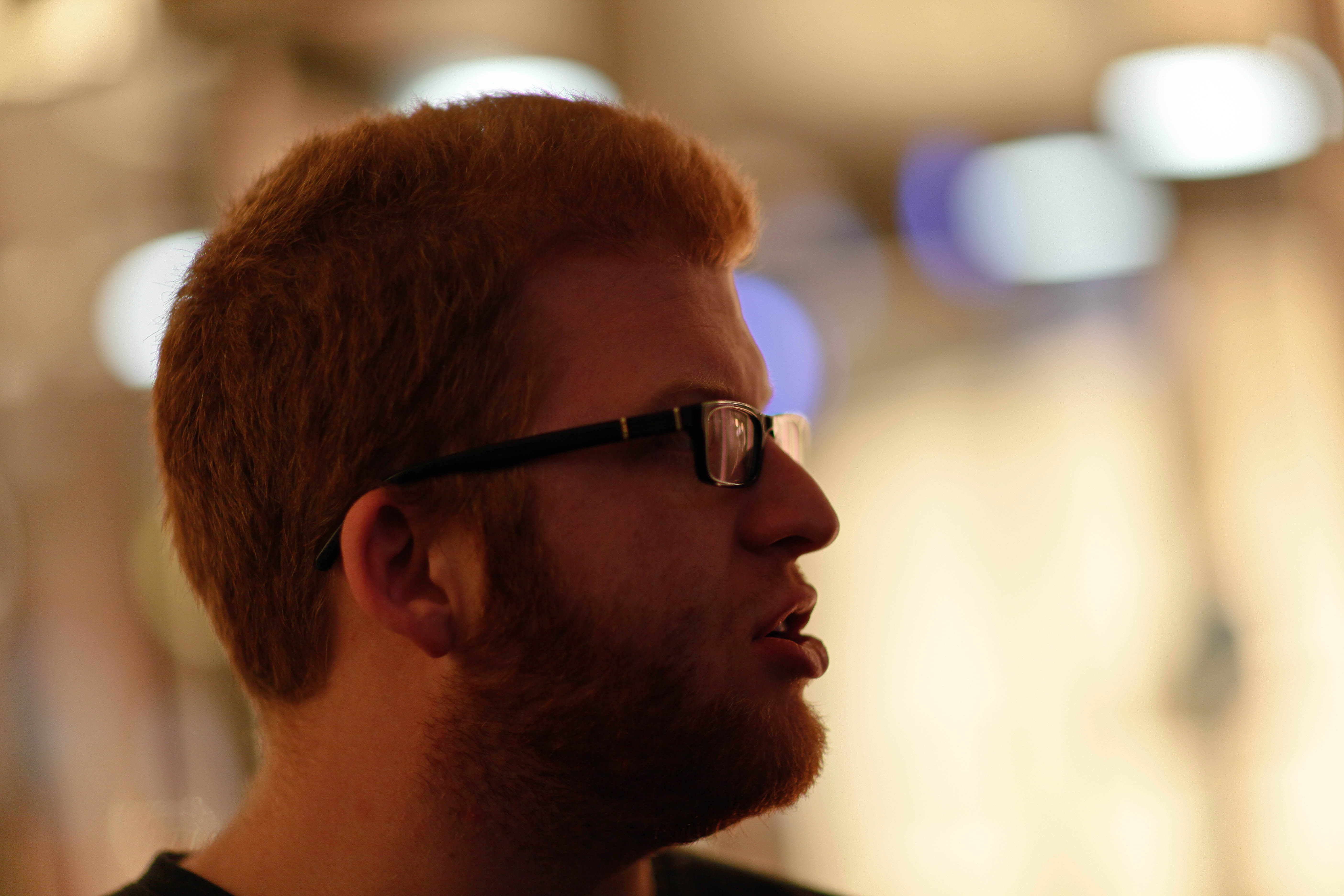 In this intimate portrait, a young man with striking red hair and glasses gazes thoughtfully to the side, capturing a moment of reflection. The warm, soft lighting accentuates the contours of his face while the blurred backdrop creates a dreamy, atmospheric quality. The overall mood is one of contemplation, inviting viewers to ponder his thoughts.