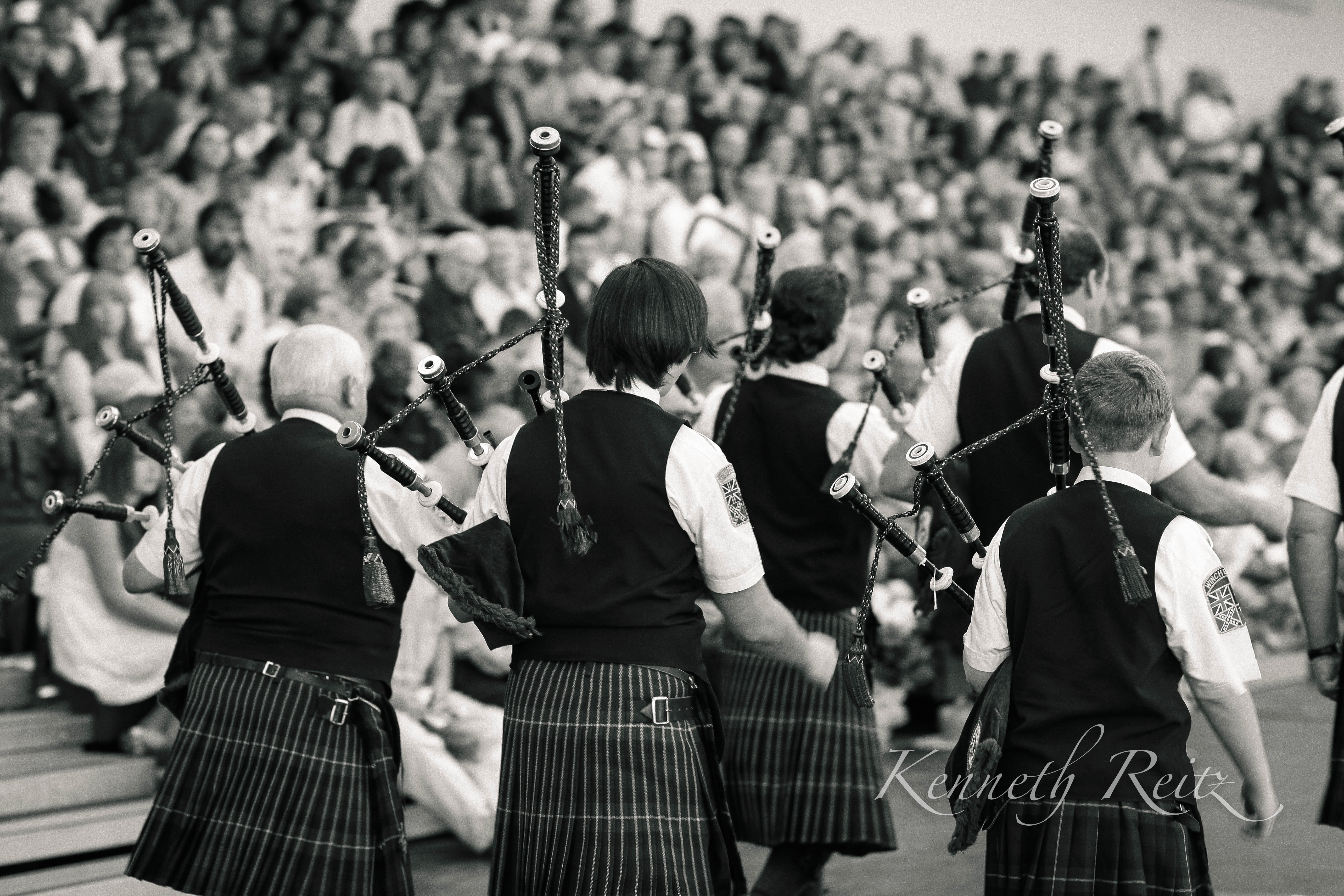 In this evocative black-and-white photograph, a group of bagpipers strides purposefully away from the camera, their kilts flowing and pipes held proudly. The blurred crowd behind them suggests anticipation and celebration, creating a dynamic contrast between the focused musicians and the atmosphere of the event. The soft lighting enhances the texture of the kilts and captures the solemnity and fervor of a cultural performance.