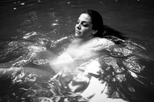 The photograph captures a serene moment of a woman floating in still water, her expression calm and contemplative. The black and white tones enhance the mood of introspection, while the ripples around her create a sense of movement contrasting with her stillness. Soft lighting highlights her features, accentuating the peaceful atmosphere of the scene.