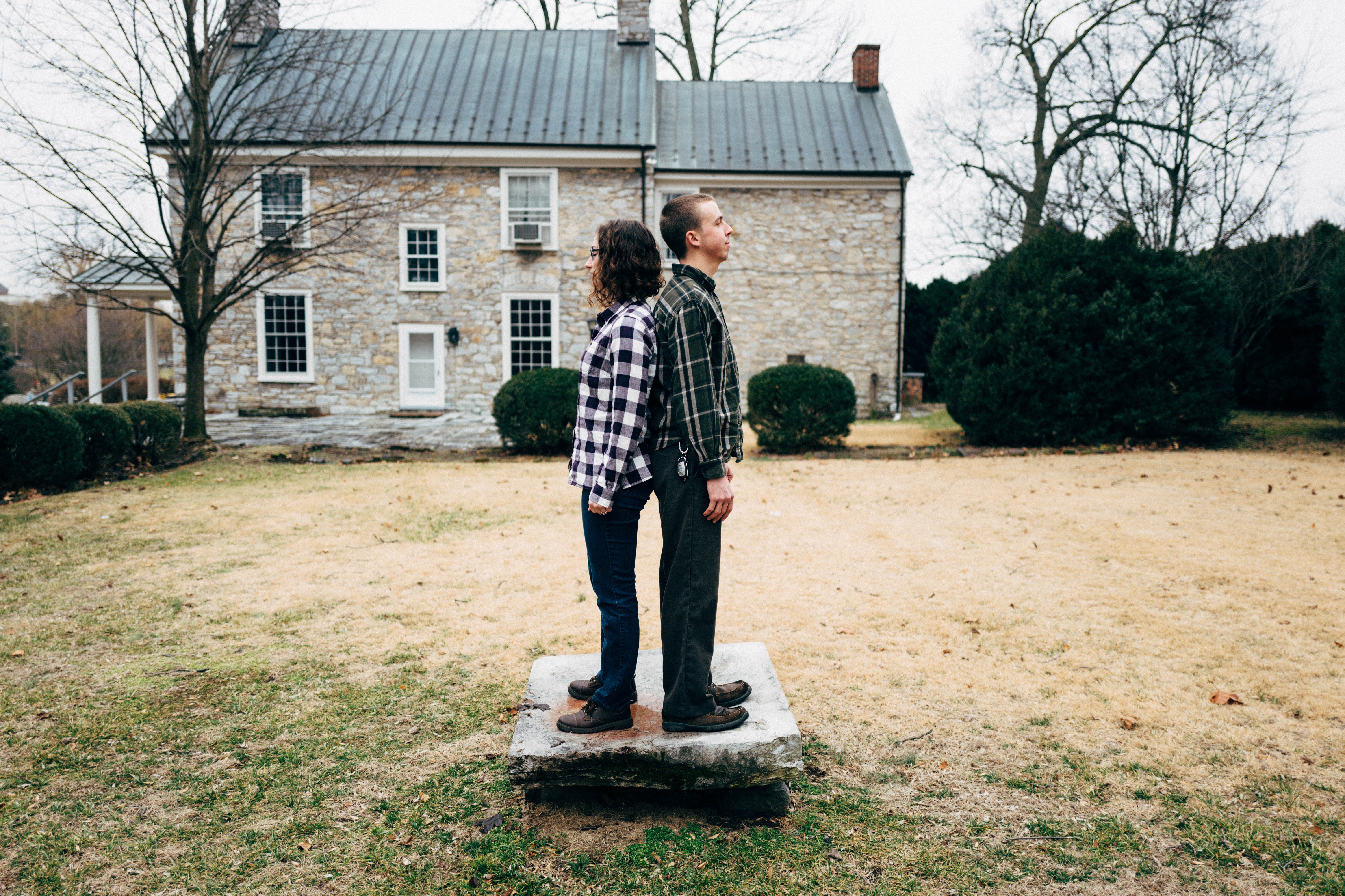 In this photograph, two individuals stand back-to-back on a stone platform, creating a striking dichotomy in their postures and attire. The muted, overcast sky casts a soft light over the scene, enhancing the somber mood, while the rustic stone house in the background adds a timeless quality to the composition. Their grounded stance against the historic backdrop evokes a sense of connection yet individuality, inviting contemplation on their relationship.