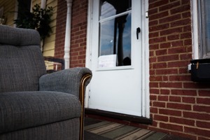 In this intimate composition, a faded, plush armchair sits just outside a classic white door framed by rich red bricks. The overcast sky casts a soft light, creating a calm, contemplative mood, while a handwritten note hints at stories waiting to unfold. The scene evokes a sense of welcoming familiarity, encouraging thoughts of conversations shared and moments cherished.