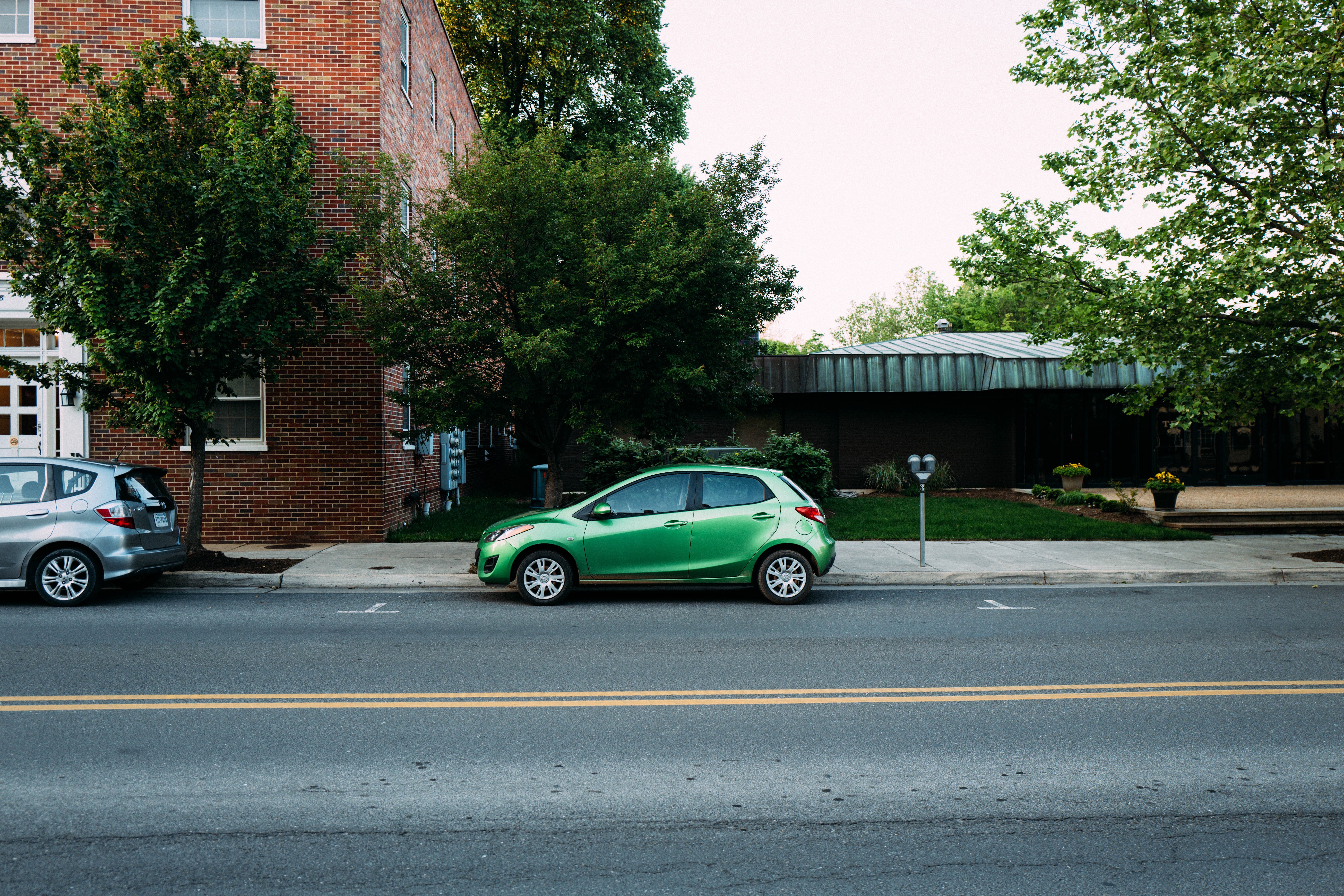 This photograph captures a serene street scene featuring a vibrant green car parked beside a slightly drab gray vehicle. The composition emphasizes the contrast between the lively color of the car and the muted tones of the surrounding environment, hinting at a peaceful urban oasis. Soft lighting highlights the greenery and the textures of the brick building, evoking a calm, inviting atmosphere.