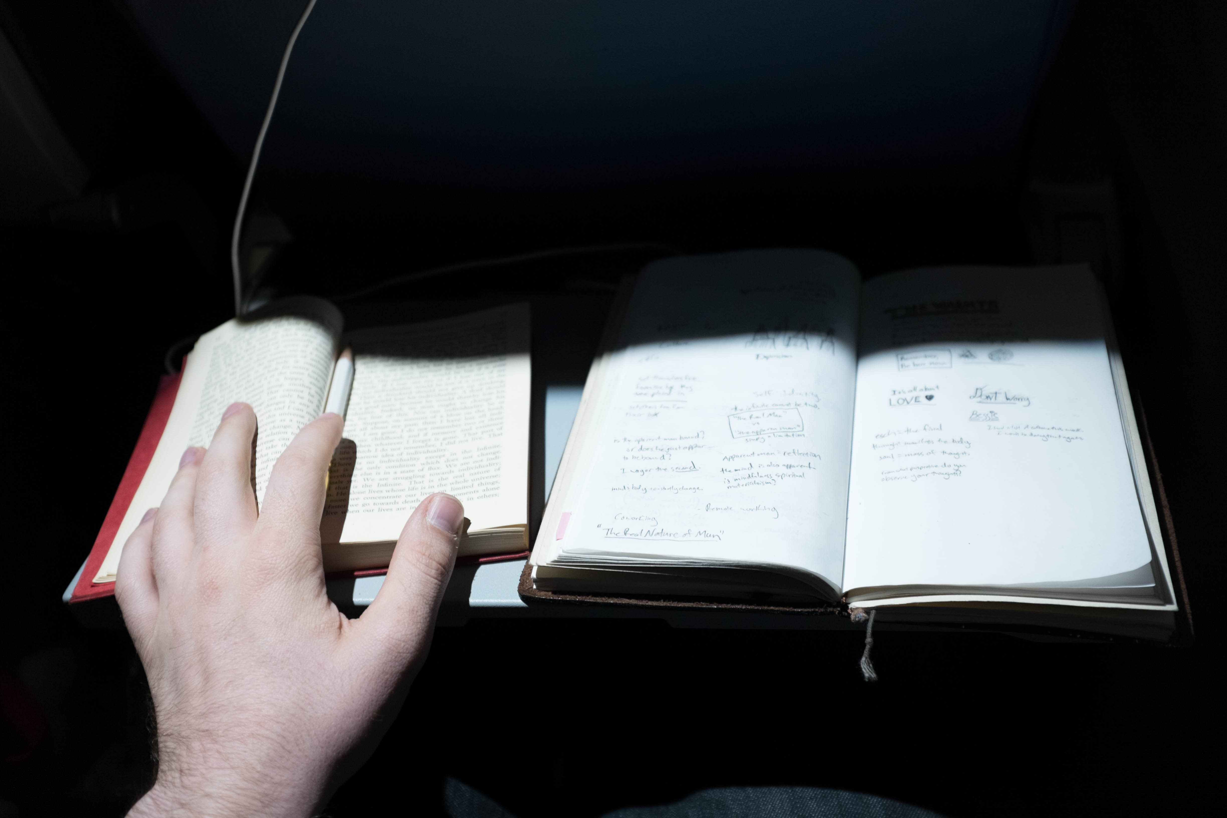 In the soft, diffused light of an airplane cabin, a hand hovers over two open books on a tray table—one a novel and the other a journal filled with handwritten notes. The contrasting textures of the pages evoke a sense of exploration and contemplation, while the stark lighting creates a thoughtful, introspective mood. This moment captures the quiet beauty of a traveler’s inner world, blending literature and personal reflection mid-flight.