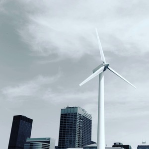 A towering wind turbine stands majestically against a backdrop of modern skyscrapers, contrasting nature and urban development. The muted, monochromatic palette evokes a sense of calm and introspection, while the soft clouds add depth to the sky. The composition emphasizes the turbine's height, symbolizing sustainability in an industrial landscape.