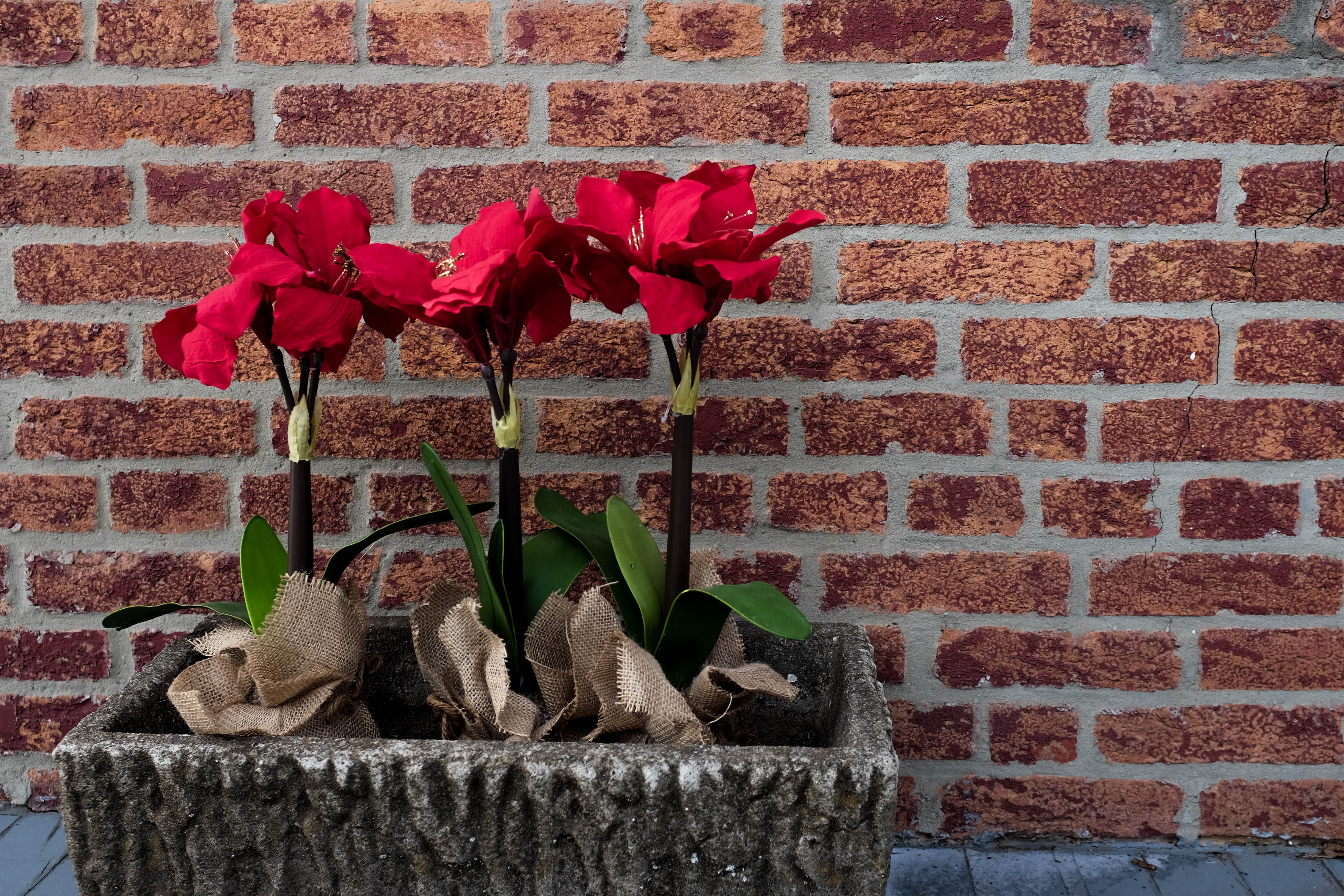 Three striking red amaryllis flowers stand tall in a textured stone planter, their lush green leaves contrasting beautifully with the rustic backdrop. The warm hues of the brick wall evoke a cozy, inviting atmosphere, enhanced by soft, natural light that highlights the petals. This composition captures a serene moment of floral beauty, celebrating the intersection of nature and urban architecture.