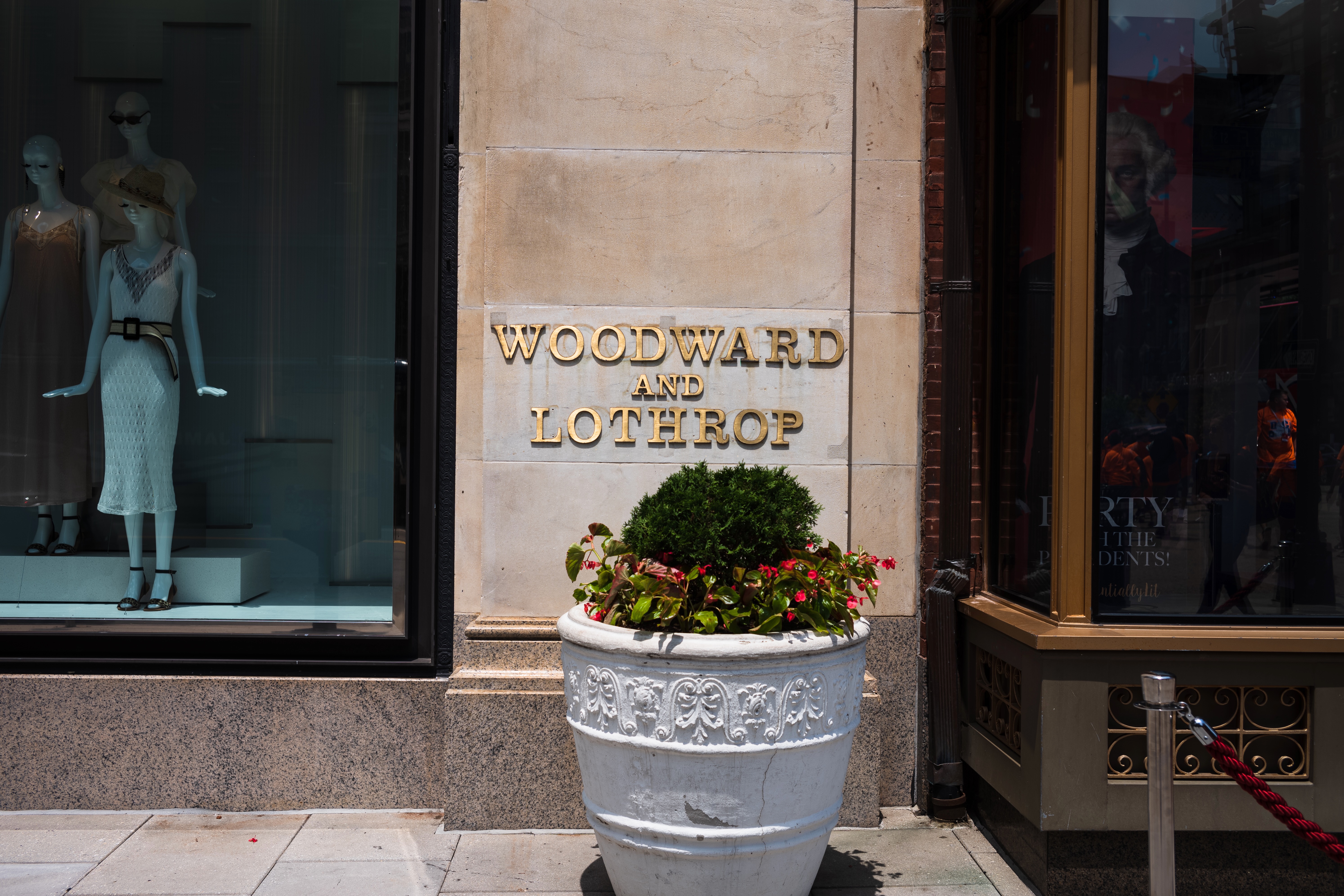 This photograph captures the elegant storefront of Woodward and Lothrop, with its classic gold signage prominently displayed against a light beige backdrop. The composition juxtaposes the sophisticated mannequins dressed in fashionable attire with lush greenery in a white pot, creating a mood of refined urban charm. Bright sunlight bathes the scene, enhancing the contrast and illuminating the delicate details of both fashion and architecture.