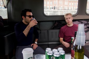The photograph captures two young men sitting on a plush sofa inside a boat, wrapped in a casual atmosphere. The lighting is soft and natural, filtering in through the window, illuminating their relaxed expressions as they enjoy drinks amidst scattered cans and bottles. This moment conveys a sense of camaraderie and leisure, inviting the viewer into their tranquil, social retreat.