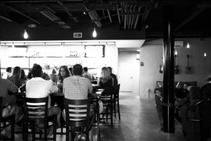 In a bustling bar setting, individuals are engaged in quiet conversations, captured in monochrome to evoke a sense of nostalgia. The warm glow of hanging light bulbs contrasts with the dark furnishings, creating an inviting yet intimate atmosphere. A lone child peeks around a pillar, adding a touch of innocence and curiosity to the scene, while the structured lines of the architecture frame the human interactions beautifully.