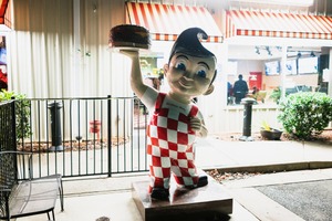 A whimsical statue of a smiling boy in checkered overalls proudly holds a chocolate cake aloft, inviting passersby to indulge. Nighttime lighting casts a warm glow around the playful figure, contrasting with the cool darkness of its surroundings. The cheerful expression and vivid colors evoke a sense of nostalgia and joy, making the scene feel inviting and friendly.
