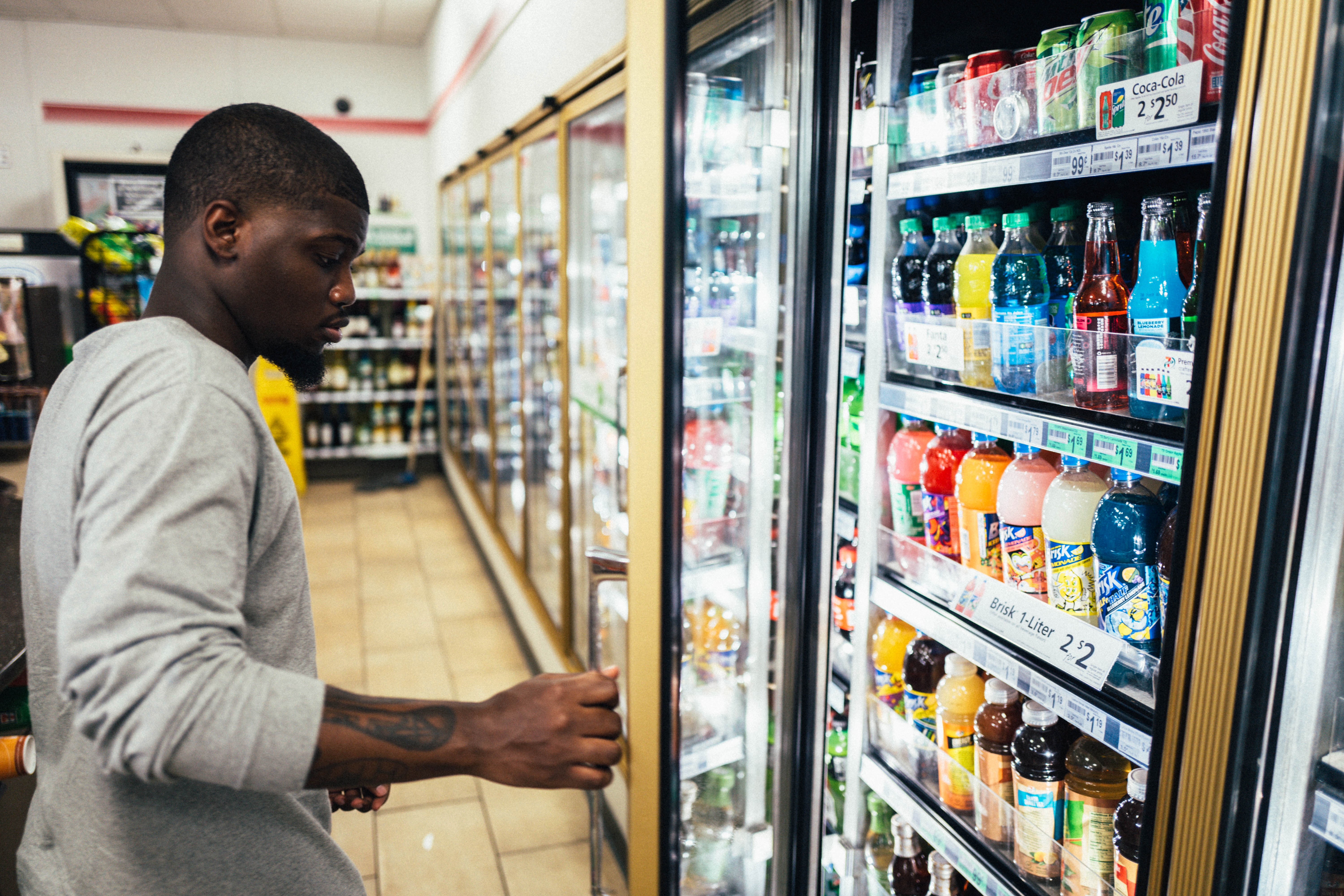A young man stands thoughtfully in front of a beverage cooler, engaged in the act of selecting a drink. The warm, natural light creates a cozy atmosphere, contrasting with the vibrant colors of the sodas, highlighting his focused expression. The composition captures the everyday hustle of a convenience store, blending casual decision-making with a sense of contemplative stillness.