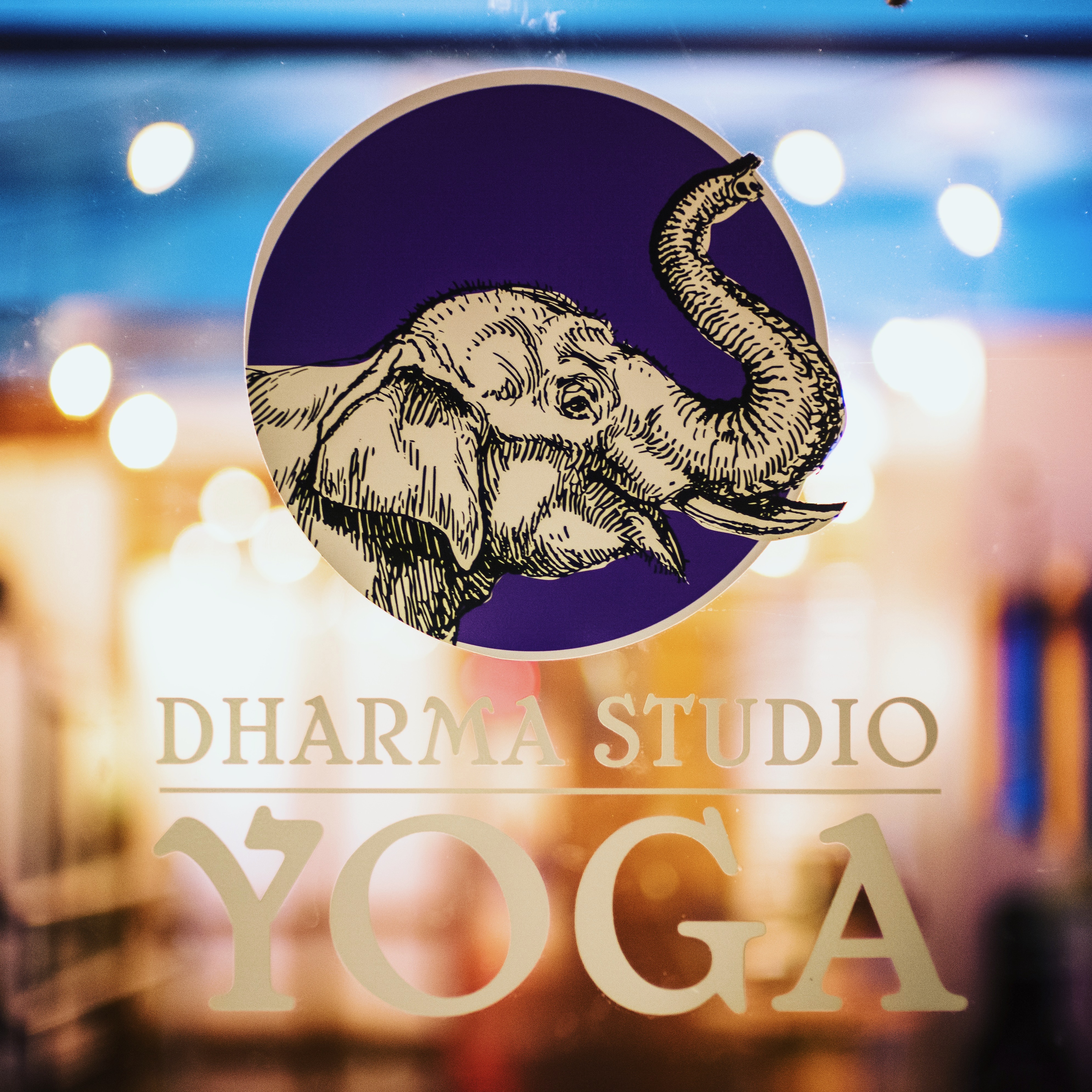 The photograph showcases a striking logo of an elephant framed against a soft, blurred background of warm lights. The mood is tranquil and inviting, characteristic of a serene yoga studio atmosphere. The composition cleverly emphasizes the detailed illustration of the elephant, while the gentle bokeh effect enhances the peaceful ambiance.