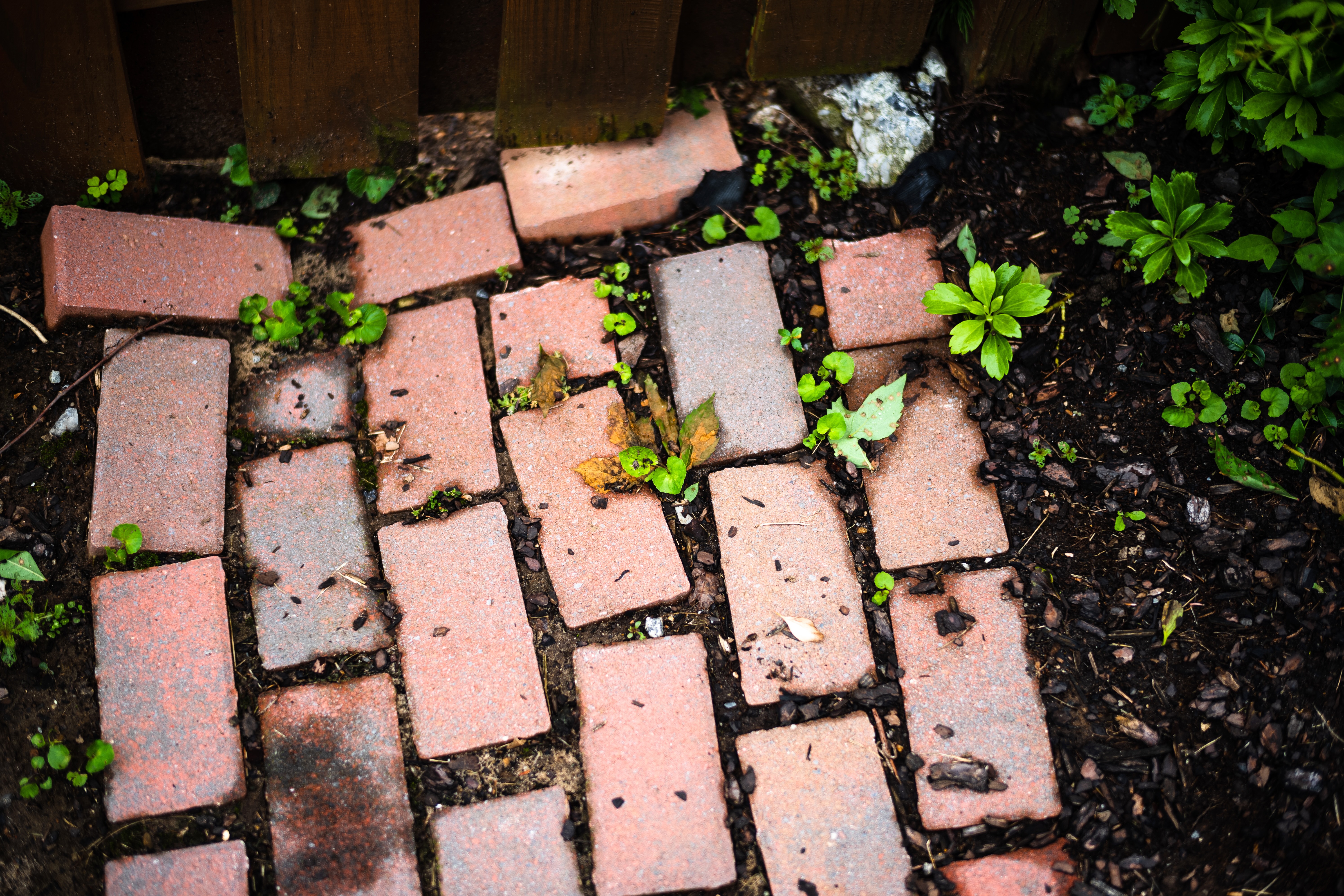 A close-up of a weathered brick path intertwined with vibrant green sprouts, showcasing the tenacity of nature. The soft, diffused lighting bathes the scene, highlighting the textures of the bricks and soil. The composition evokes a sense of quiet tranquility, inviting contemplation on life's persistent growth amidst decay.