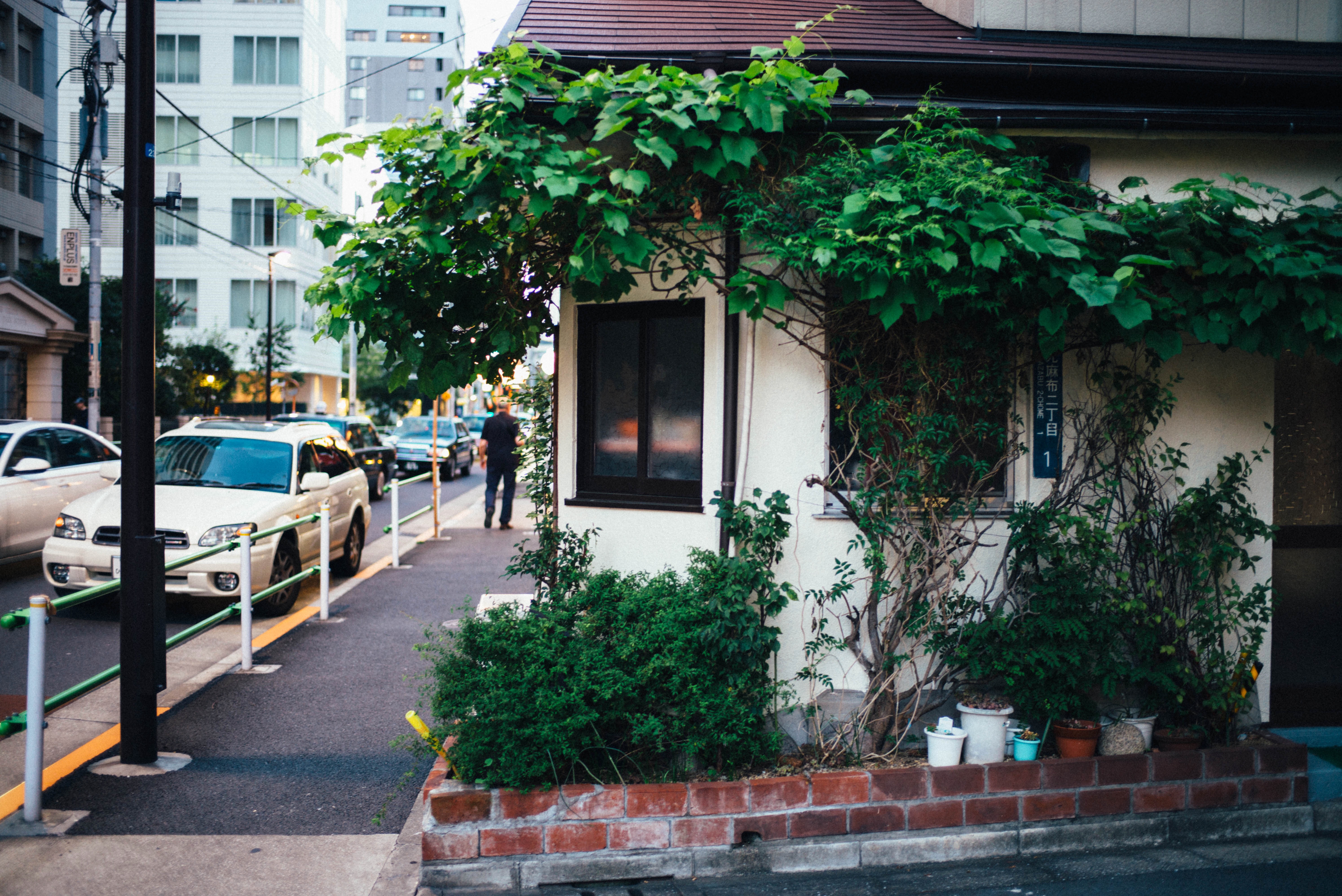 A cozy corner of city life, this photograph captures a quaint house adorned with lush green vines, standing juxtaposed against modern buildings. The soft evening light casts a warm glow, enhancing the tranquility of the scene, while a figure strolls leisurely down the street. The composition invites a sense of calm amidst urban hustle, blending nature with architecture harmoniously.
