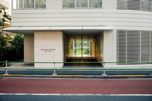 The photograph captures the sleek entrance of the 'Grande Maison' amidst a contemporary urban setting. With its clean lines and minimalistic design, the exterior exudes a sense of sophistication, while the golden light filtering through suggests warmth and invitation. Lush greenery visible beyond the glass doors adds a refreshing contrast to the structured architecture, creating a harmonious balance between nature and design.