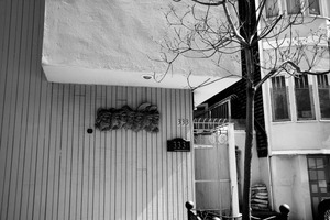 This photograph captures an intriguing building facade embellished with a sculptural element that showcases three faces, contrasting against the stark white wall. The mood evokes a sense of quiet contemplation, enhanced by the muted tones of the black and white image. A barren tree branches across the composition, adding a touch of nature to the urban setting, while soft lighting creates gentle shadows, emphasizing the textures of the surface.
