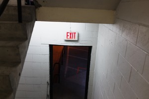 The photograph captures a dimly lit stairwell leading to an exit, evoking a sense of intrigue and solitude. The stark contrast between the bright exit sign and the shadowy surroundings creates a compelling mood, inviting contemplation about what lies beyond. The composition, with the angled staircase descending into the darkness, draws the viewer's eye toward the open door, suggesting a journey to undiscovered spaces.