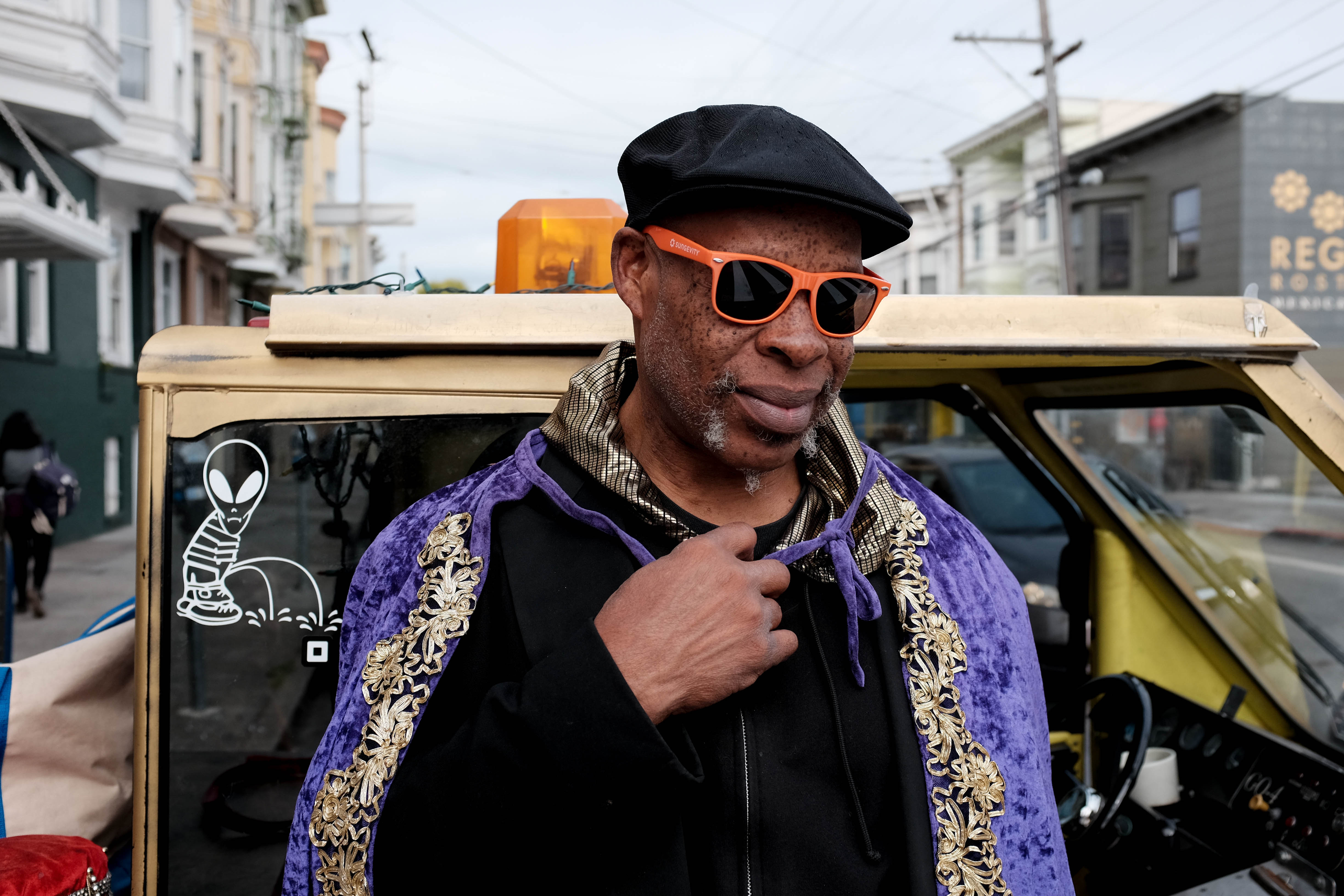 In this striking photograph, a man exudes confidence and style against an urban backdrop. The vibrant orange sunglasses and regal purple cape contrast with the muted tones of the city, creating a bold visual impact that celebrates individuality. The soft, diffused lighting adds a sense of openness, enhancing the approachable mood of the scene.