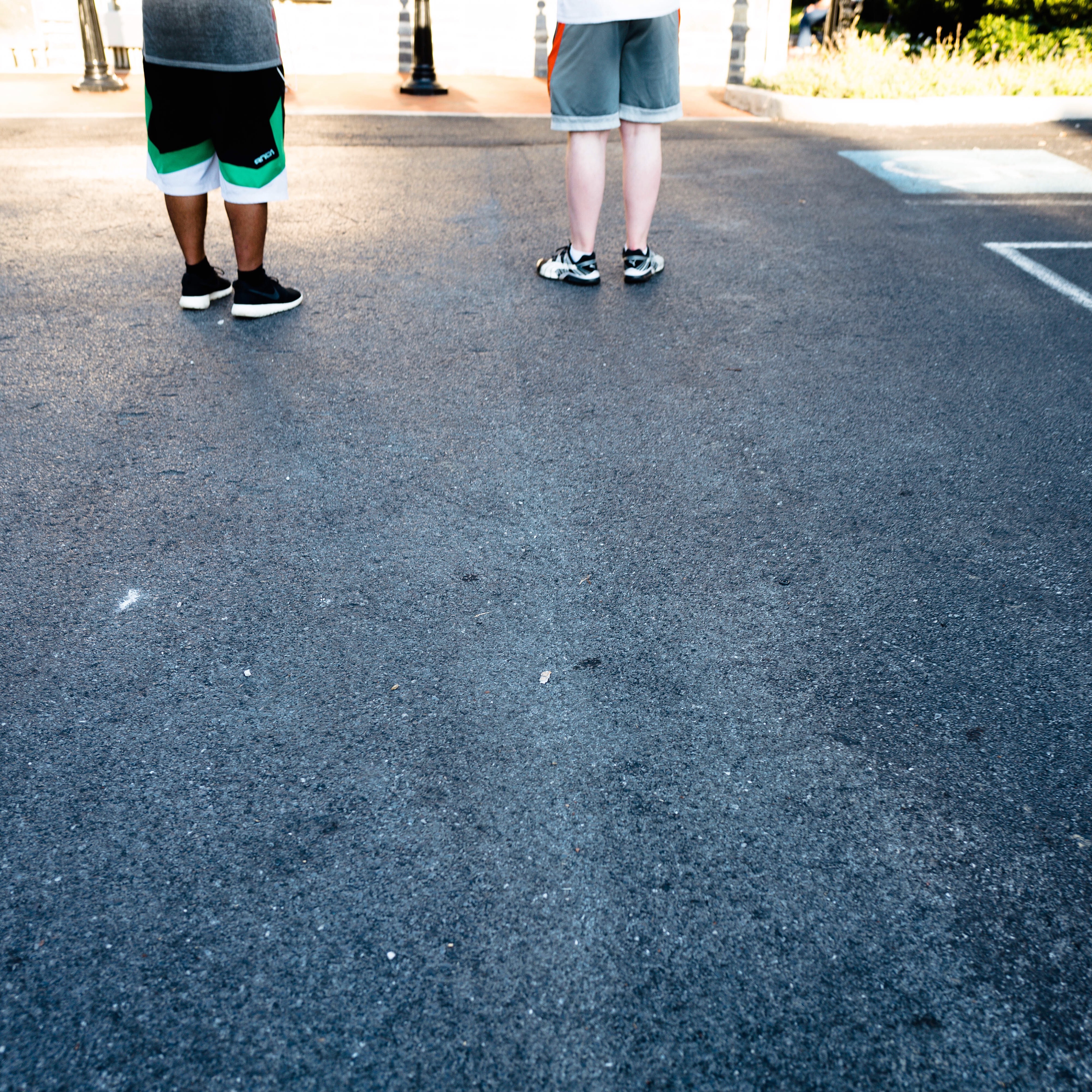 Two figures stand on a sunlit asphalt surface, capturing a moment of quiet anticipation. The contrasting tones of their shorts hint at individuality, while the bright lighting creates a casual, relaxed atmosphere. The composition draws attention to their stance, suggesting a shared experience as they gaze ahead into the scene before them.