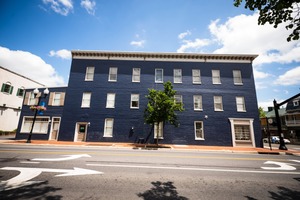 A striking blue building stands prominently against a backdrop of bright, partly cloudy skies. The composition highlights both the architectural details and the gentle greenery, creating a tranquil yet vibrant mood in an urban setting. The warm sunlight casts soft shadows, enhancing the textures of the brick and inviting a sense of calmness to the scene.