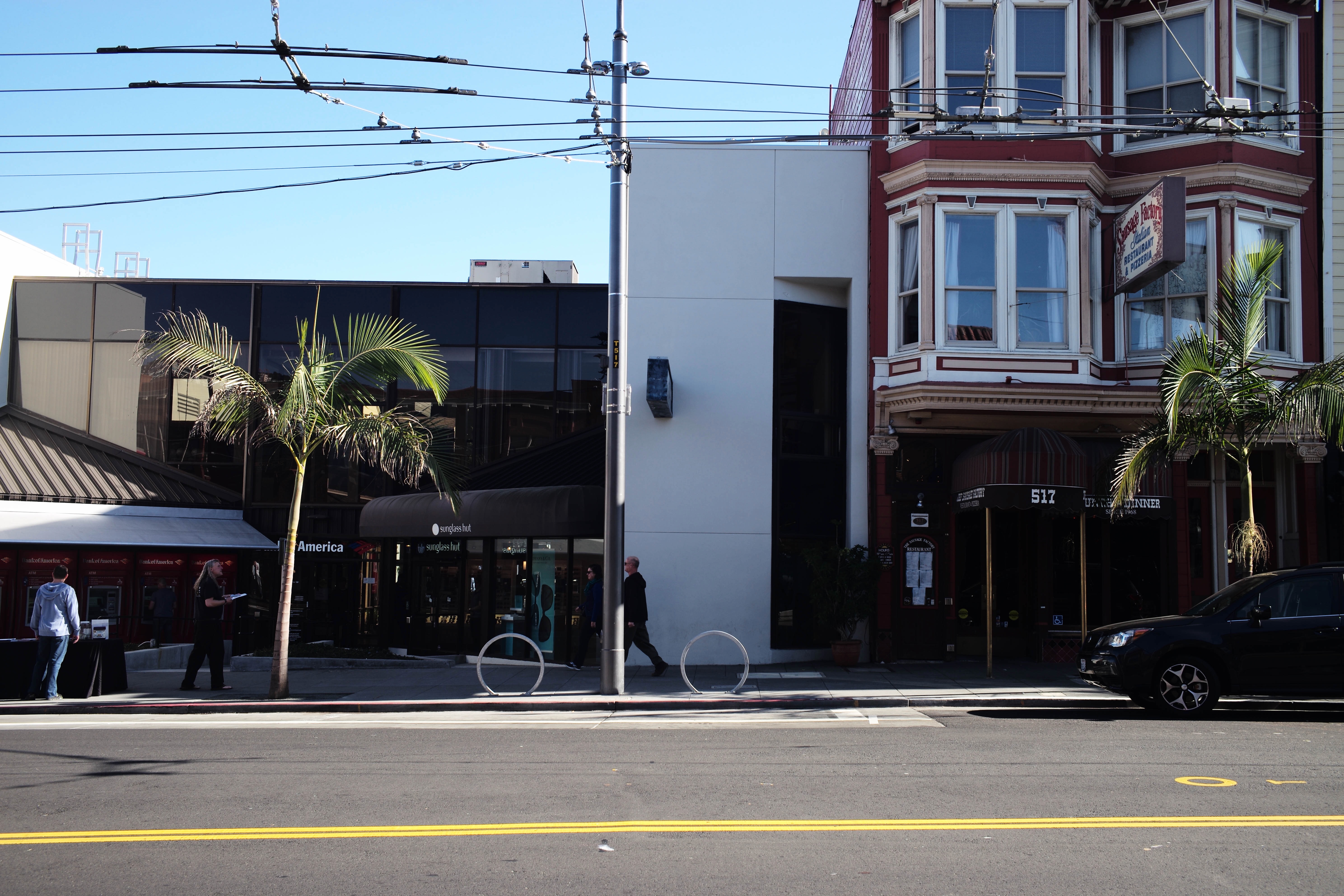 This photograph captures a striking urban scene, featuring a modern glass structure beside a classic Victorian-style building. The bright, clear blue sky enhances the dynamic contrast between old and new, creating a lively ambiance. Sparse palm trees and pedestrians add depth, suggesting a bustling yet relaxed city atmosphere.