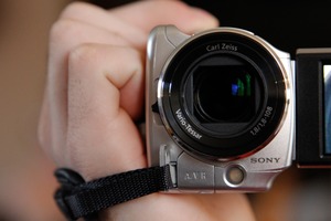 In a close-up shot of a hand gripping a silver Sony camera, the emphasis is on the lens, showcasing its intricate details and branding. The lighting captures a polished sheen, juxtaposing the softness of the hand, while a hint of anticipation fills the frame, suggesting a fleeting moment ready to be immortalized. The composition draws the viewer’s focus into the camera, inviting them to ponder the stories it can capture.