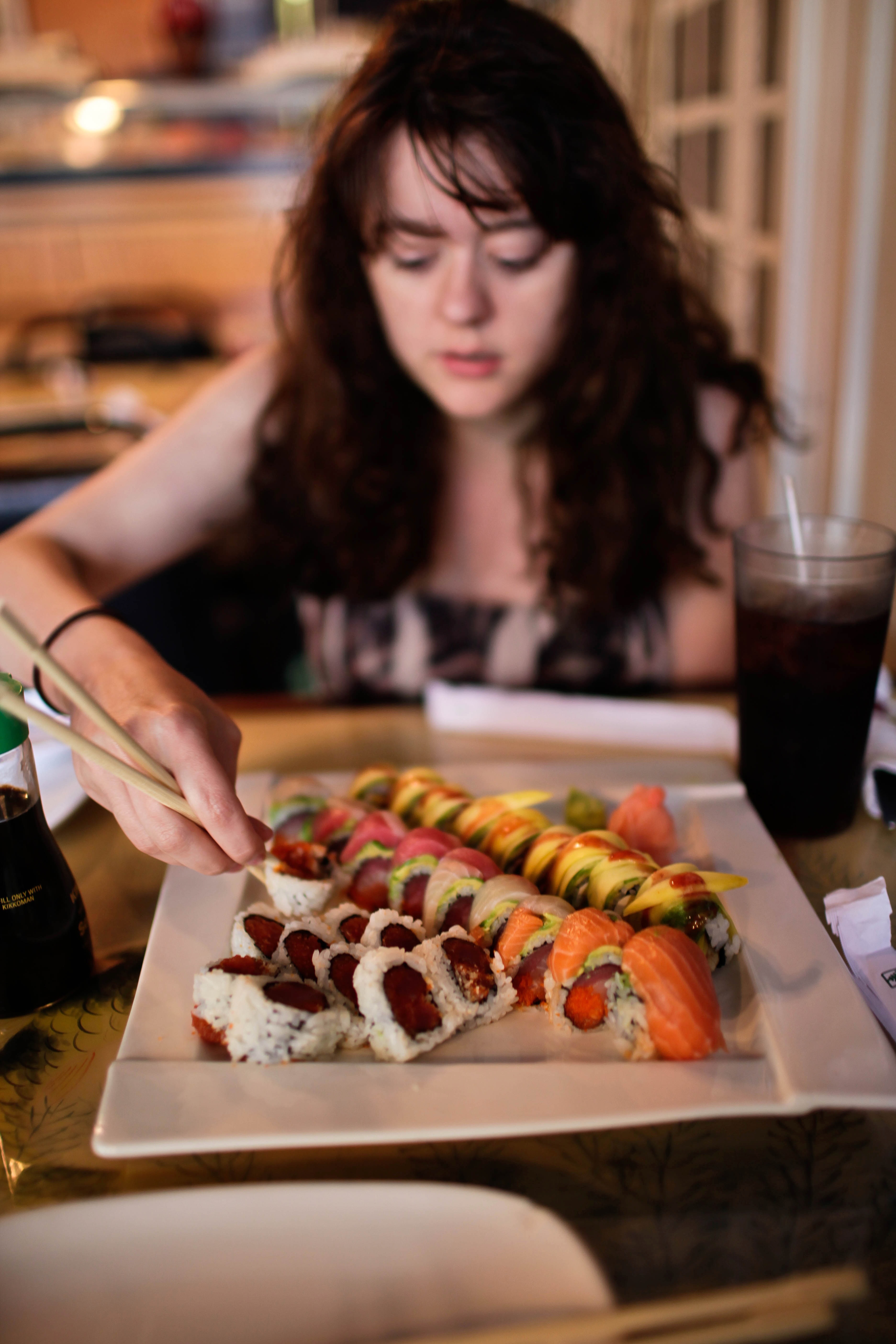 A young woman focuses intently on a vibrant array of sushi displayed on a white plate. The warm, inviting lighting accentuates the freshness of the sushi and creates a cozy atmosphere, highlighting the joy of a shared meal. Her contemplative expression and the meticulous way she handles her chopsticks reflect both concentration and anticipation.