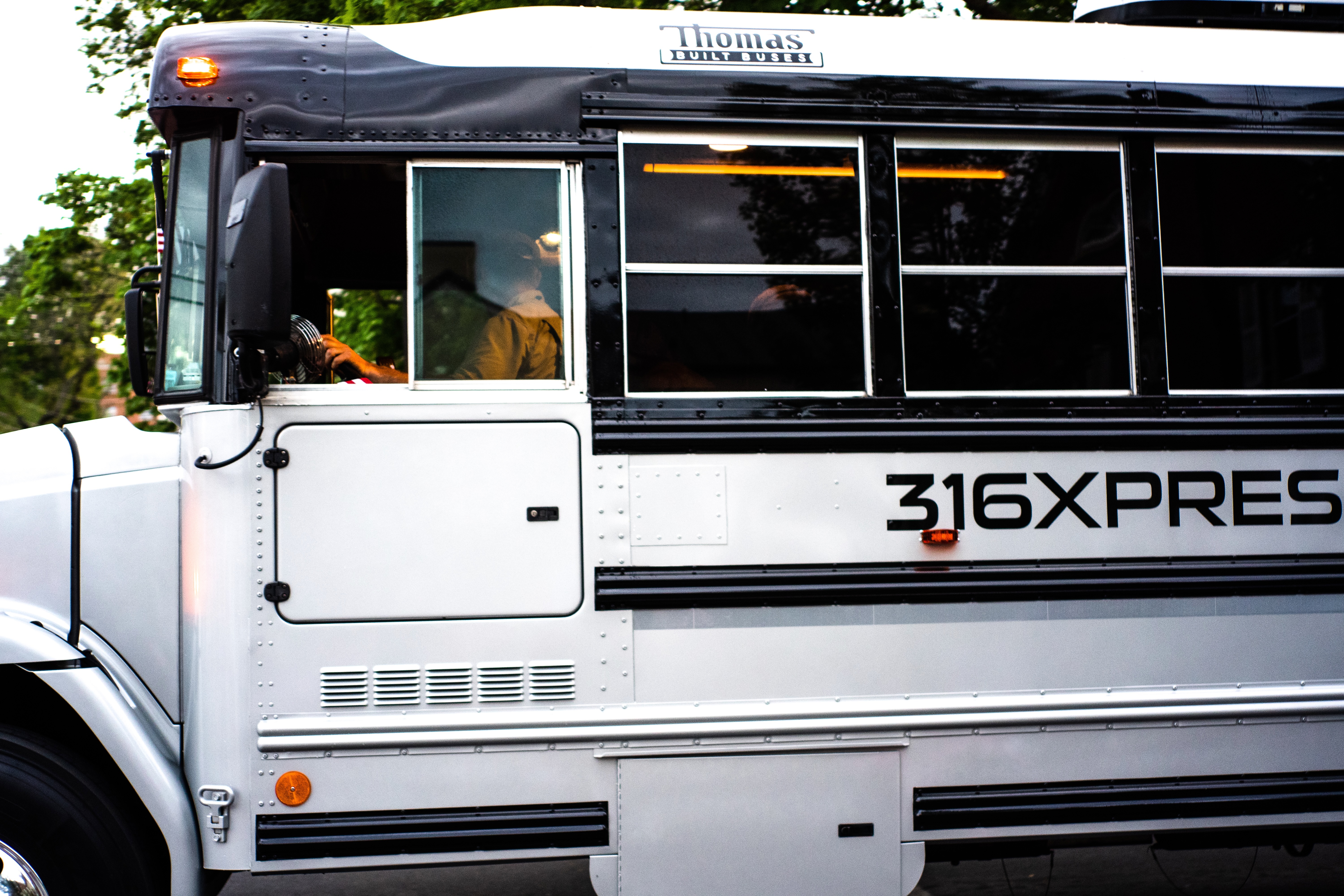 The photograph captures a sleek, modern bus amid a tranquil urban setting, its silver exterior glinting softly in the fading light. A solitary figure is glimpsed through the open window, evoking a sense of solitude and contemplation as shadows stretch across the scene. The composition is balanced, drawing attention to the bus's clean lines while the surrounding greenery adds a touch of life to the quiet moment.