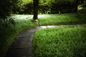 This enchanting photograph captures a winding stone pathway meandering through lush, vibrant grass, inviting the viewer to explore the tranquil garden. Sunlight filters through the leaves, casting a gentle, warm glow over the verdant scene, enhancing the sense of peace and solitude. A solitary lantern nestled among the greenery adds a touch of whimsy, embodying the harmony between nature and man-made beauty.