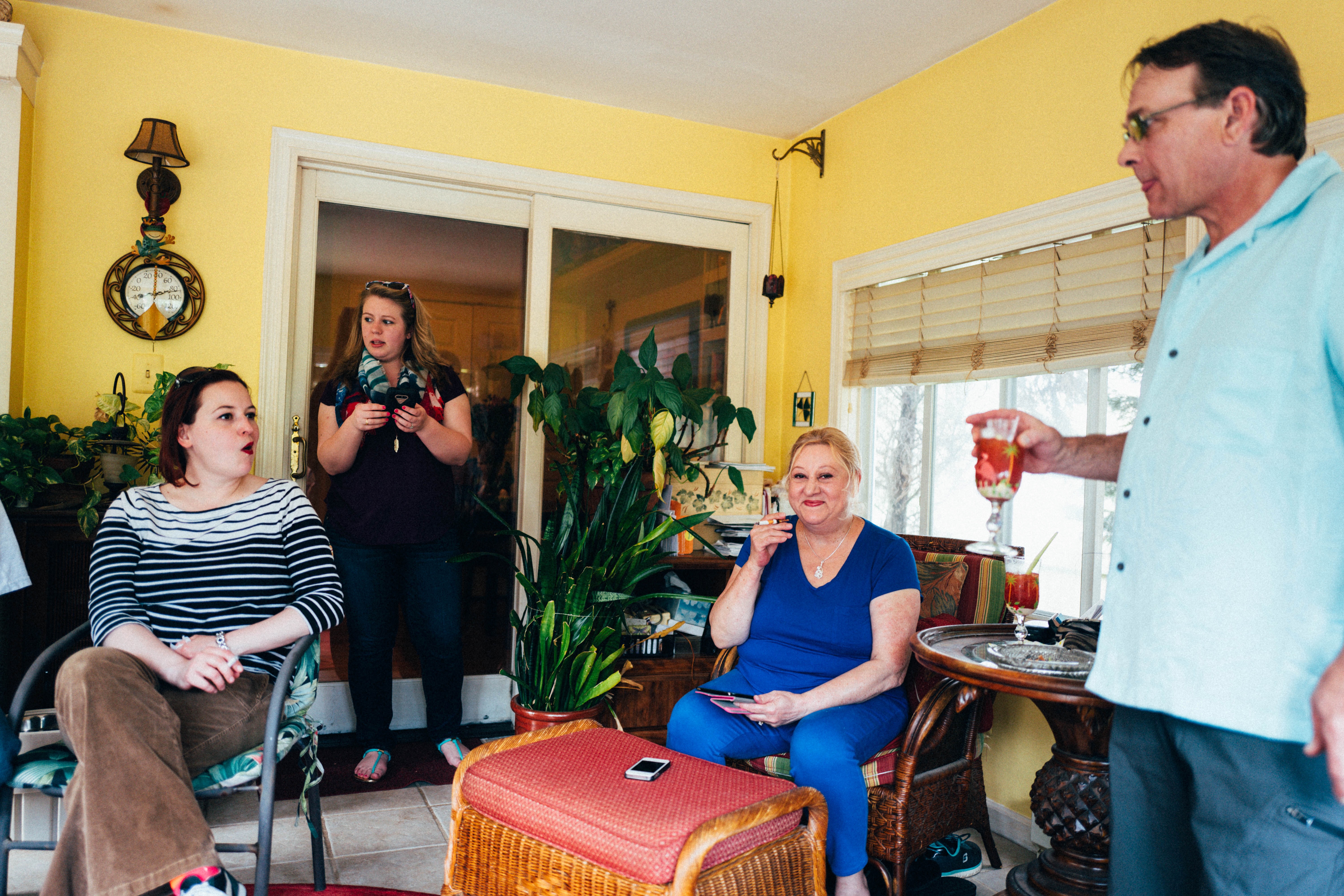 In a cozy, sunlit room adorned with vibrant yellow walls, a group of four individuals engage in lively conversation, capturing a moment of connection and warmth. The atmosphere is relaxed and inviting, enhanced by the presence of lush green plants and tasteful decor. With a blend of lighthearted expressions and intimate body language, the image exudes a sense of camaraderie and joy during a casual gathering.