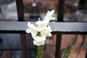 A delicate white flower emerges through the dark, geometric lines of a wrought iron gate, contrasting nature's softness with urban rigidity. The blurred background hints at a calm setting, while the focus on the flower evokes a sense of quiet determination. Soft, diffused lighting enhances the ethereal quality of the scene, creating a serene yet poignant moment of beauty amidst the man-made structure.