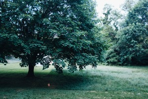 A lush, green tree dominates one side of the frame, its dense foliage creating an inviting canopy. The soft, diffused light enhances the tranquil mood, casting gentle shadows on the grass and revealing a serene, untouched landscape. The composition draws the viewer's eye into the peaceful greenery, evoking a sense of calm and solitude.