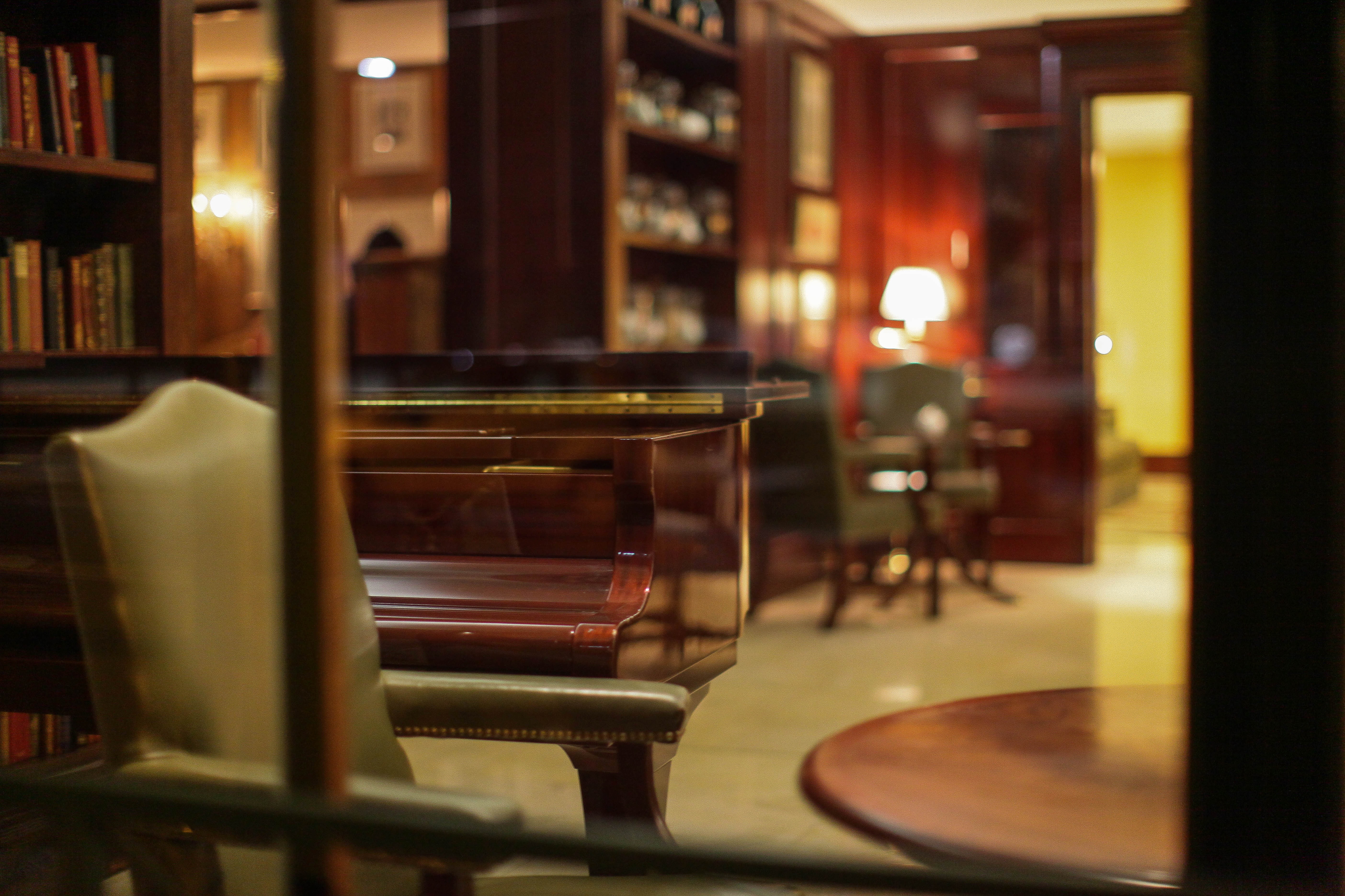 This photograph captures a refined interior space, highlighting a polished piano and elegant furniture. Warm, inviting lighting enhances the intimate atmosphere, suggesting a space meant for quiet reflection or conversation. The composition invites the viewer to peek into this serene moment, framed by the window's outline.