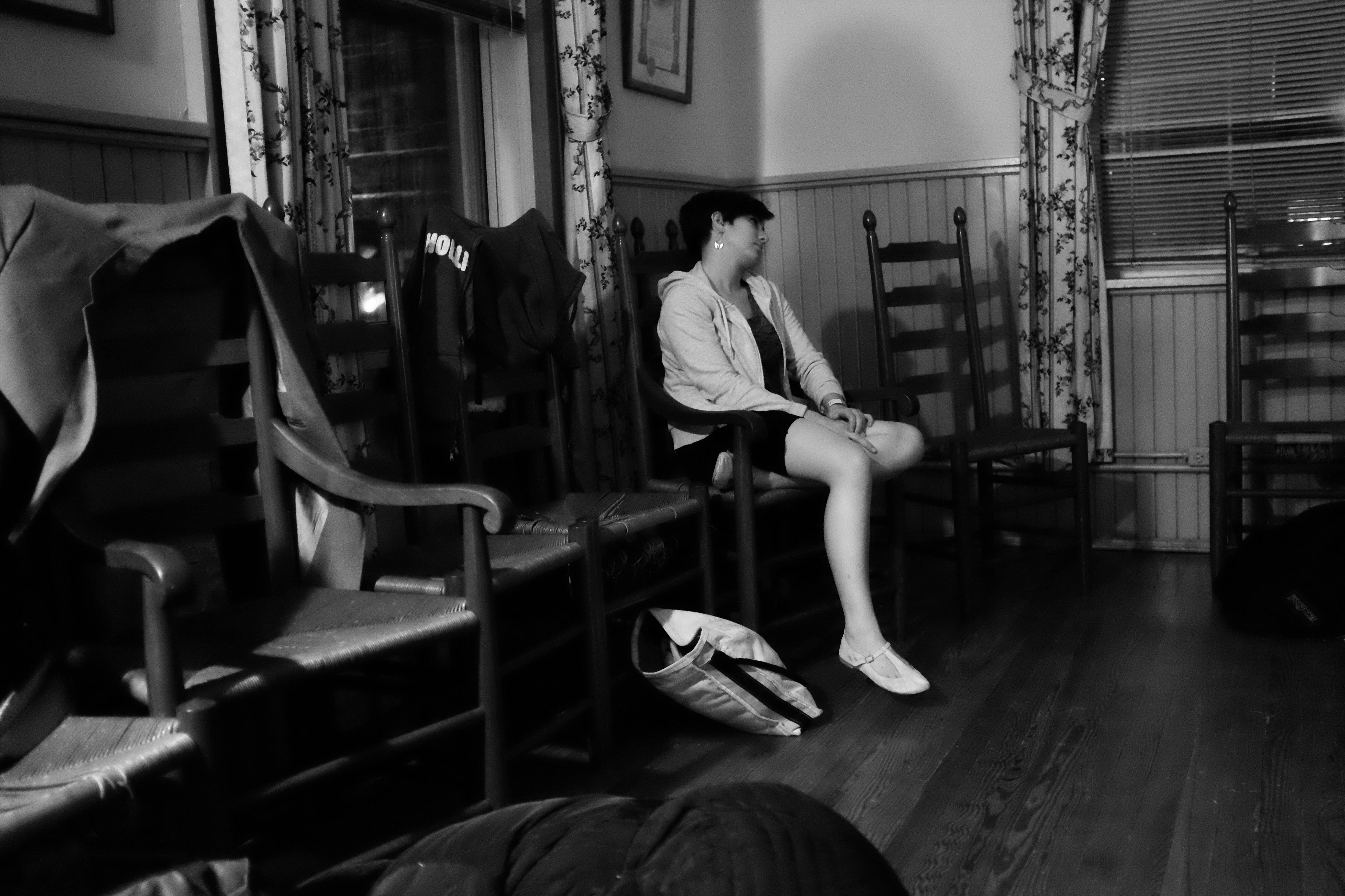 In a dimly lit room, a young woman sits pensively on a chair, surrounded by a collection of empty rocking chairs. The monochromatic tones enhance the introspective mood, while the soft shadows cast across the floor create a sense of solitude. Her relaxed posture and distant gaze suggest a moment of quiet contemplation amidst the stillness of the space.